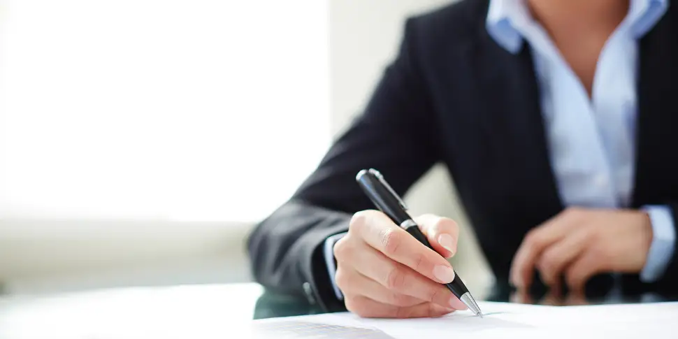 Redacción de una autorización: el titular actual firma un documento donde deja claro que autoriza a otra persona a tramitar el cambio de titularidad del contrato de luz en su nombre.